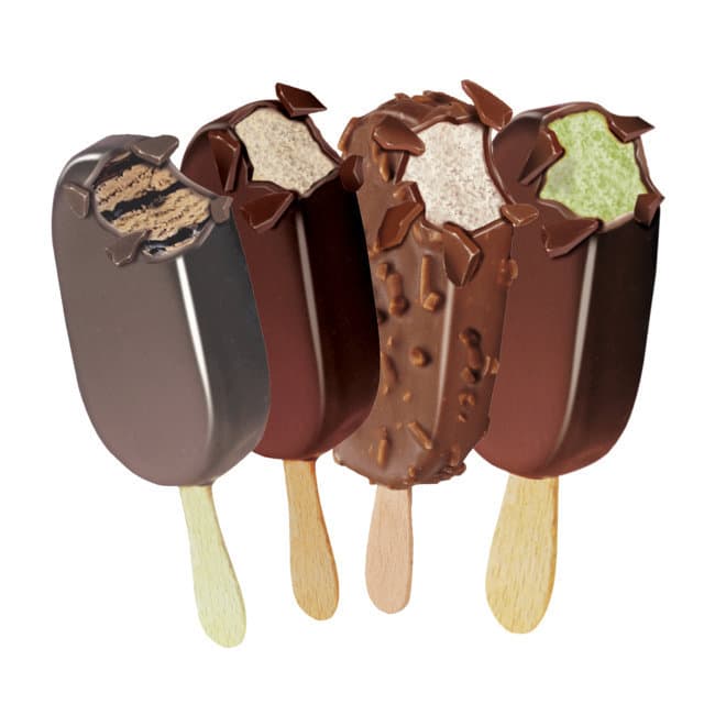 Ingredienti: latte scremato reidratato, copertura al cioccolato fondente 25% (pasta di cacao, zucchero, burro di cacao, emulsionante: lecitina di soia, aromi), zucchero, sciroppo di glucosio, pasta pistacchio (6% nel gelato al pistacchio), zucchero, mandorle, pistacchio 10%, olio di cocco, amido di mais, emulsionante: lecitina di soia, aromi, coloranti: E100, E141), olio di cocco raffinato, lattosio e proteine del latte, burro, colorante naturale: clorofillina, emulsionante E471, stabilizzante: E410, E412, E407, aromi, Può contenere tracce di arachidi o altra frutta a guscio.