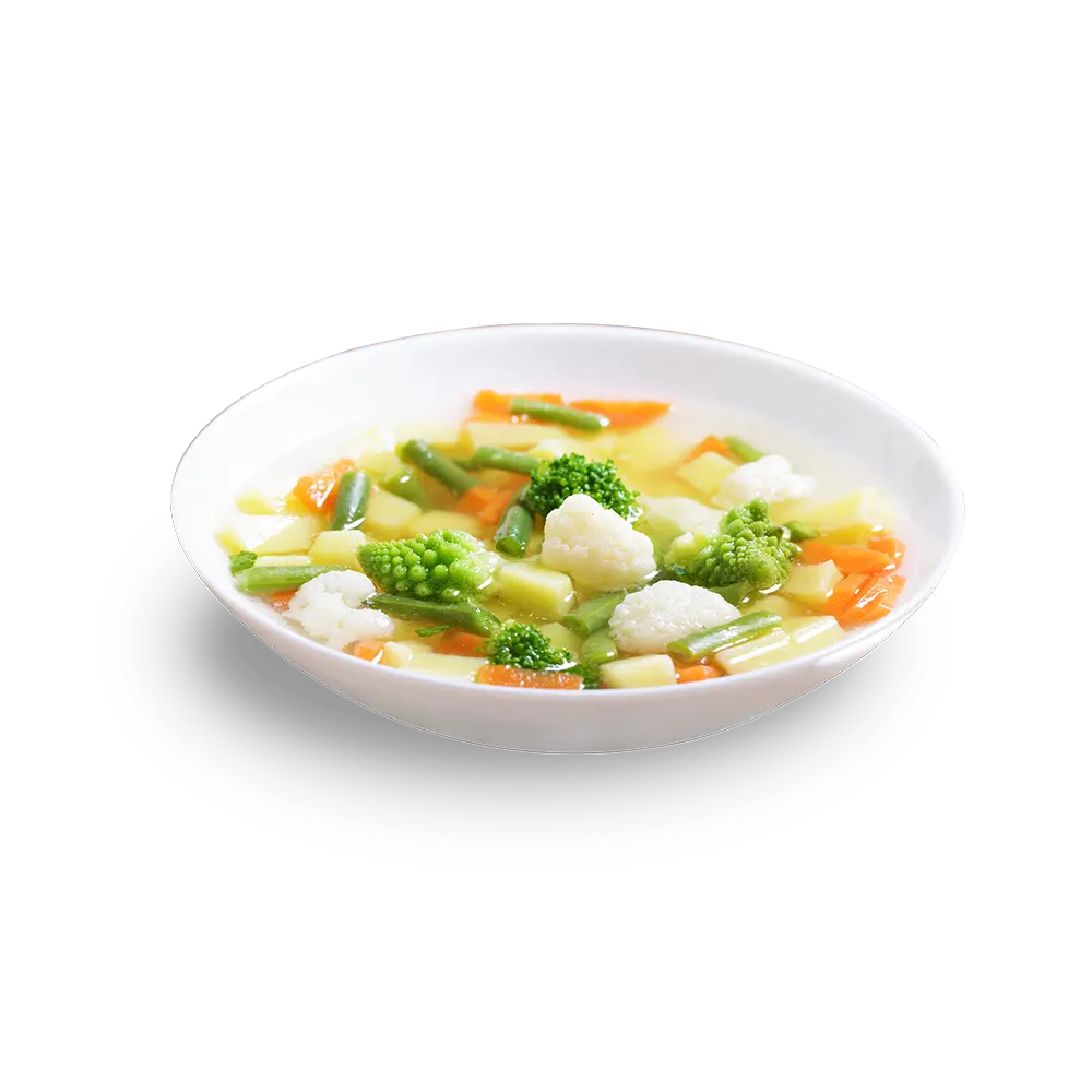 Ingredienti: Carote cub. 12x12 mm L.I. 18,0%, Zucchine cub. 12x12 mm L.I. 14,0%, Fagiolini cut 1 inch L.I. 14,0%, Cavolfiori torsoli cub. 12x12 mm L.I. 12,0%, Pomodoro non pelato 12x12 mm L.I. 12,0%, Sedano coste cub. 12x12 mm L.I. 7,0%, Porro cubetto 12x12 mm L.I. 5,5%, Zucca cub. 12x12 mm L.I. 5,0%, Bieta foglie cub. 19x21x14 mm L.I. 5,0%, Funghi champignons a fette L.I. 4,5%, Prezzemolo tritato L.I. 1,0%, Basilico ventilato L.I. 1,0%, Aglio cub. 4x4 mm L.I. 1,0%.