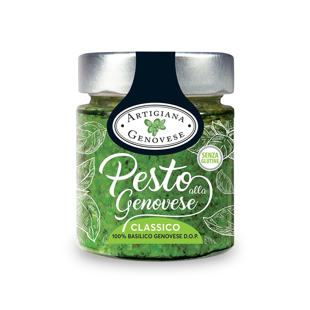 Il pesto alla genovese DOP è un condimento di altissima qualità, realizzato con basilico genovese, olio extravergine d'oliva e parmigiano reggiano, tutti ingredienti selezionati con cura per garantire un sapore autentico e inconfondibile. Questo pesto è prodotto a Prà (GE), una località conosciuta come la "culla del basilico", dove la tradizione ligure e le condizioni ambientali uniche danno vita a un basilico dal profumo intenso e dal gusto inimitabile.