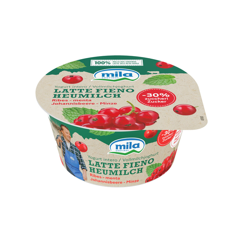 RIBES E MENTA: Yogurt (latte fieno STG intero*, fermenti lattici vivi), Preparazione al ribes rosso e menta 17% (ribes rosso e polpa di ribes rosso da concentrato 40%, acqua, zucchero di canna, amido modificato di tapioca, estratto di menta 0,1%, concentrato di carota nera, addensante: pectina; aromi naturali, correttore di acidità: citrato di sodio), Senza glutine, Non OGM, Senza conservanti aggiunti, *Specialità Tradizionale Garantita