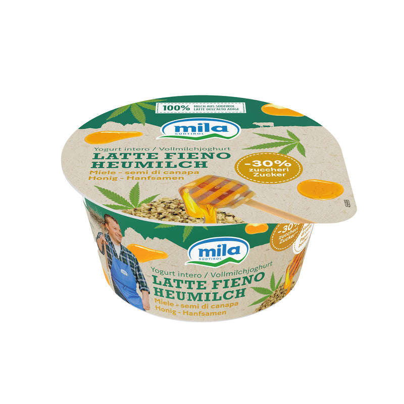 MIELE E SEMI DI CANAPA: Yogurt (latte fieno STG intero*, fermenti lattici vivi), Preparazione al miele e semi di canapa 15% (acqua, miele 28%, zucchero di canna, amido modificato di tapioca, semi di canapa macinati 2,7%, addensante: pectina; aroma naturale, succo concentrato di limone), Senza glutine, Non OGM, Senza conservanti aggiunti, *Specialità Tradizionale Garantità